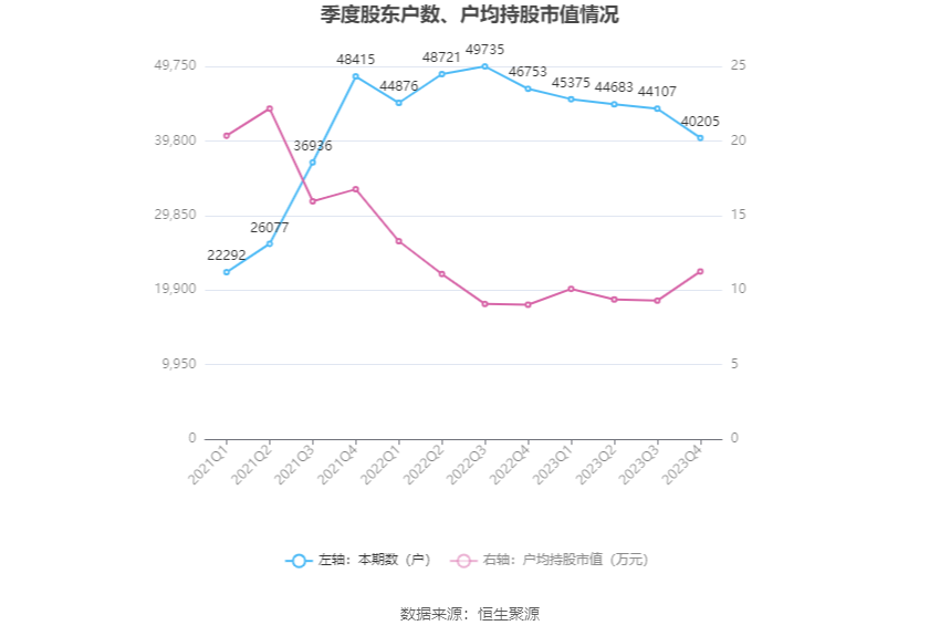 筹码集合度方面,适度2023年年末,公司鼓舞总户数为4.02万户,较三季度末下跌了3902户,降幅8.85%;户均执股市值由三季度末的9.29万元飞腾至11.25万元,增幅为21.10%。