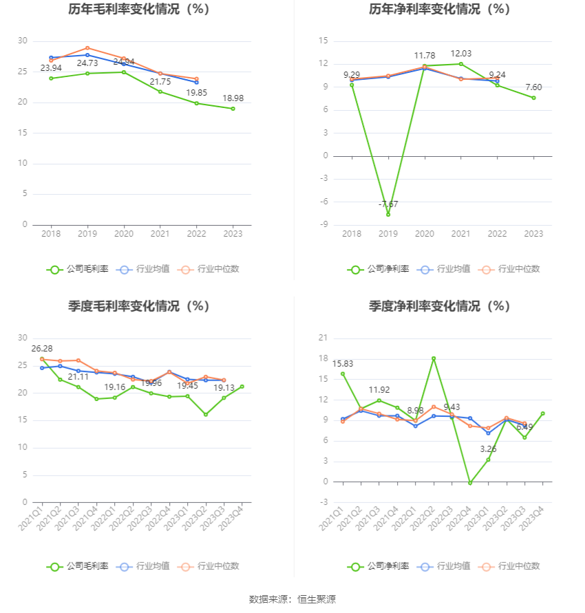 2023年,公司毛利率为18.98%,同比下跌0.87个百分点;净利率为7.60%,较上年同时下跌1.64个百分点。从单季度野心来看,2023年第四季度公司毛利率为21.21%,同比飞腾1.86个百分点,环比飞腾2.08个百分点;净利率为10.02%,较上年同时飞腾10.17个百分点,较上一季度飞腾3.53个百分点。