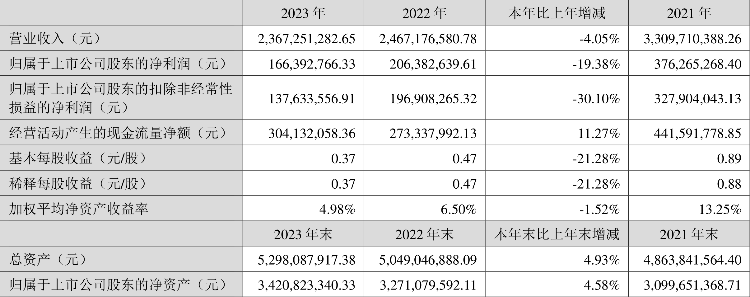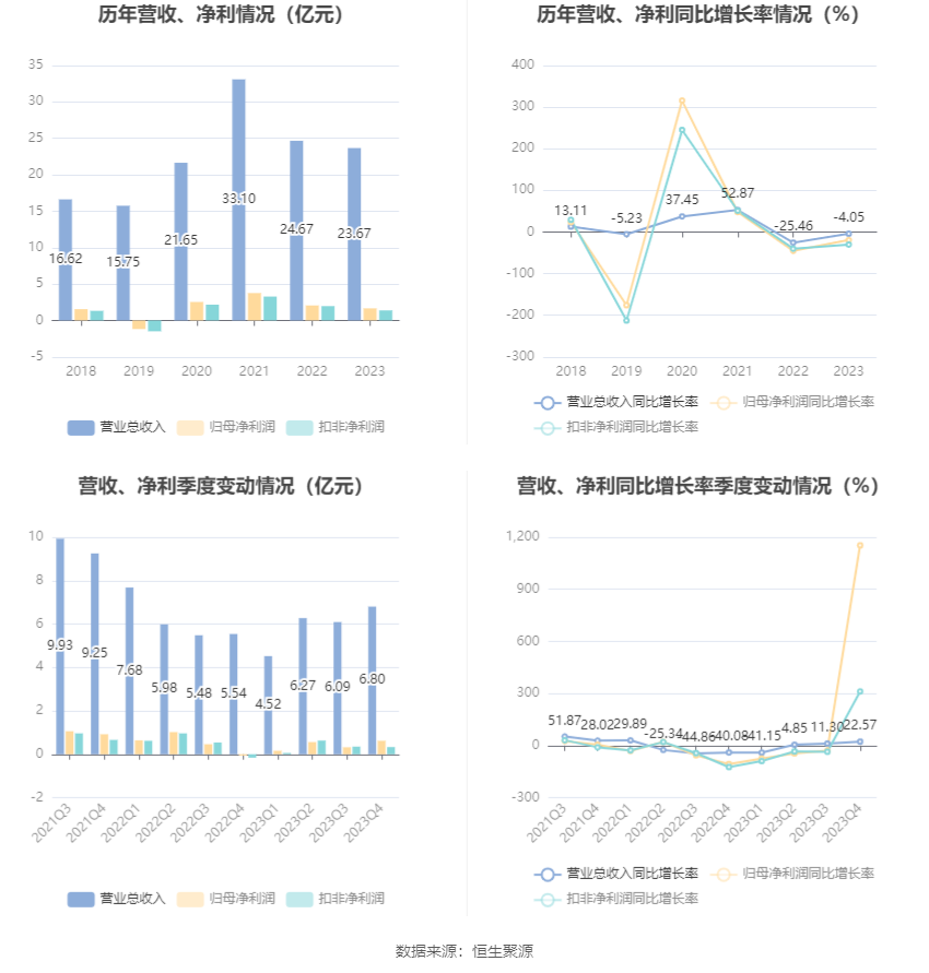 中证智能财讯山东威达(002026)4月23日袒露2023年年报。2023年,公司竣事买卖总收入23.67亿元,同比下跌4.05%;归母净利润1.66亿元,同比下跌19.38%;扣非净利润1.38亿元,同比下跌30.10%;计划行径产生的现款流量净额为3.04亿元,同比增长11.27%;申报期内,山东威达基本每股收益为0.37元,加权平均净钞票收益率为4.98%。