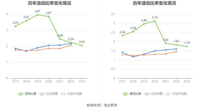 2023年,公司流动比率为2.05,速动比率为1.74。