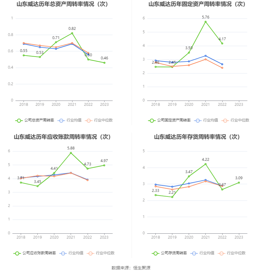 营运才气方面,2023年,公司公司总钞票盘活率为0.46次,上年同时为0.50次(2022年行业平均值为0.56次,公司位居同业业51/78);公司应收账款盘活率、存货盘活率区分为4.97次、3.09次。