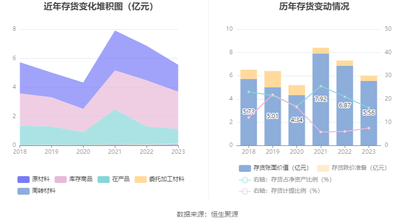 从存货变动来看,适度2023年年末,公司存货账面价值为5.56亿元,占净钞票的16.25%,较上年末减少1.32亿元。其中,存货跌价准备为4520.99万元,计提比例为7.52%。