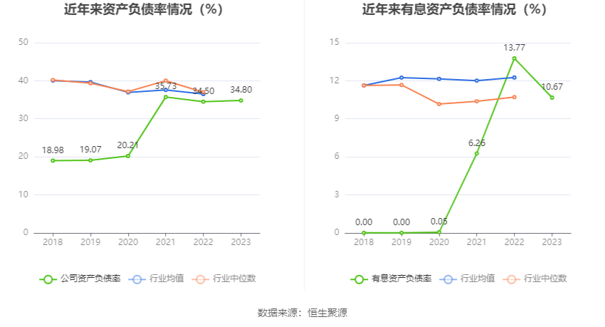 在偿债才气方面,公司2023年年末钞票欠债率为34.80%,比拟上年末飞腾0.30个百分点;有息钞票欠债率为10.67%,比拟上年末下跌3.10个百分点。