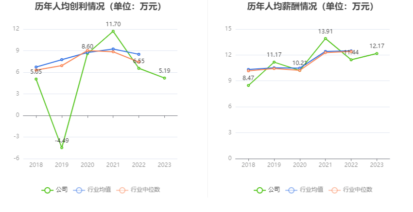 适度2023年末,公司职工总额为3203东说念主,东说念主均创收73.91万元,东说念主均创利5.19万元,东说念主均薪酬12.17万元,较上年同时候别变化-5.64%、-20.71%、6.39%。