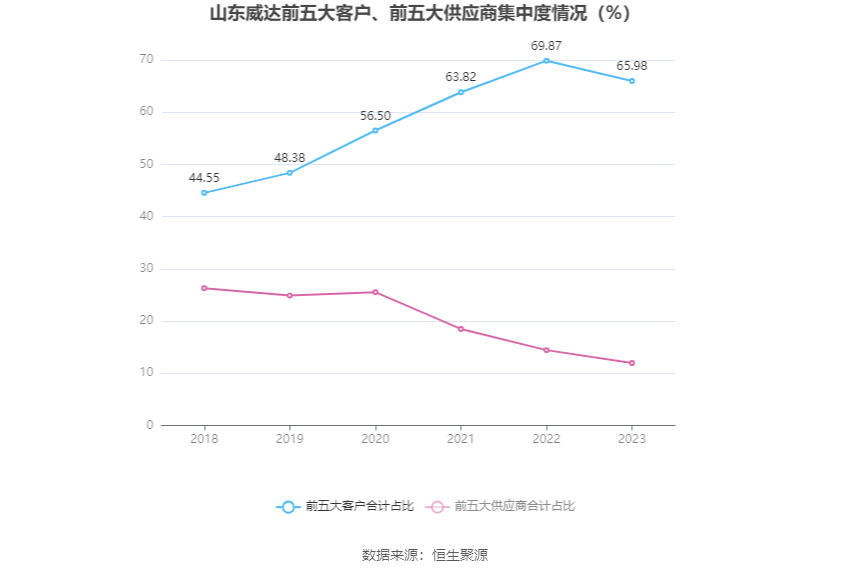 申报期内,公司前五大客户统共销售金额15.62亿元,占总销售金额比例为65.98%,公司前五名供应商统共采购金额1.73亿元,占年度采购总额比例为11.95%。