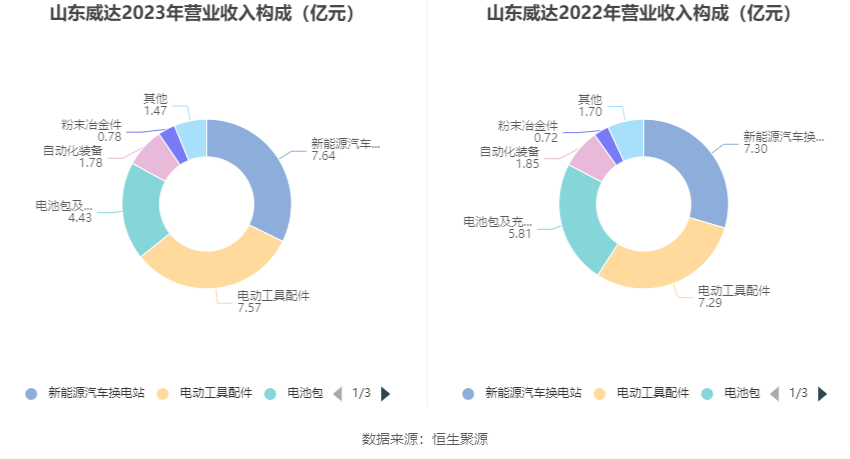 分居品来看,2023年公司主买卖务中,新动力汽车换电站收入7.64亿元,同比增长4.75%,占买卖收入的32.29%;电动器具配件收入7.57亿元,同比增长3.82%,占买卖收入的31.98%;电板包及充电器收入4.43亿元,同比下跌23.75%,占买卖收入的18.71%。