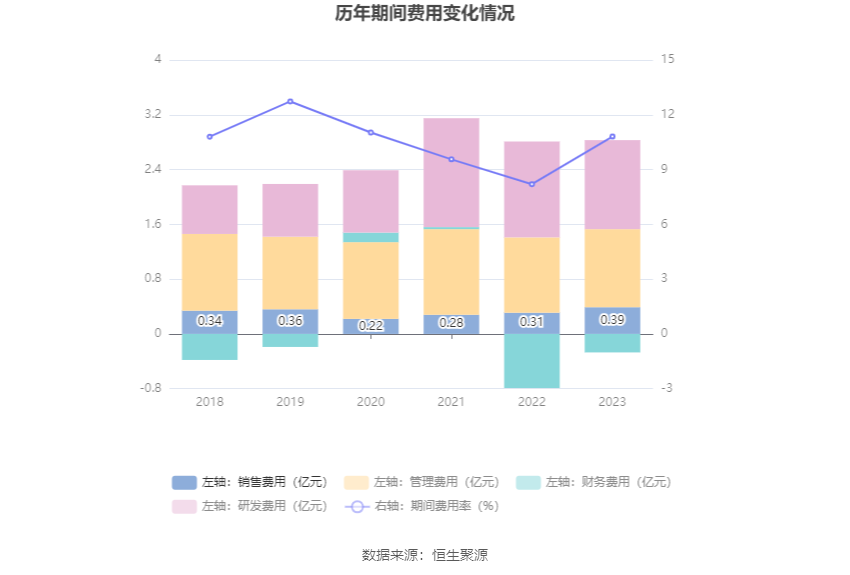 2023年,公司时期用度为2.56亿元,较上年同时加多5363.41万元;时期用度率为10.81%,较上年同时飞腾2.61个百分点。其中,销售用度同比增长24.65%,搞定用度同比增长3.81%,研发用度同比下跌7.37%,财务用度由昨年同时的-7896.39万元变为-2683.79万元。
